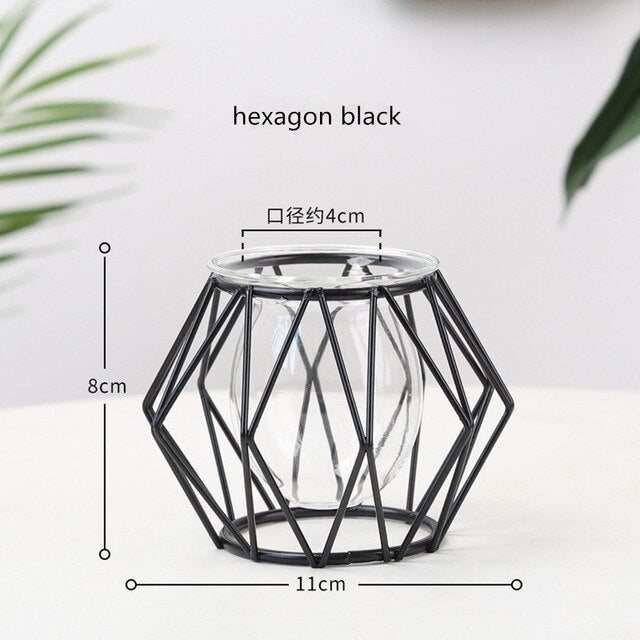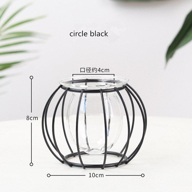 Nordic Style Golden Black Glass Hydroponic Iron Line Flower Vase Metal Plant Holder Vases Ornament Modern Home Decor